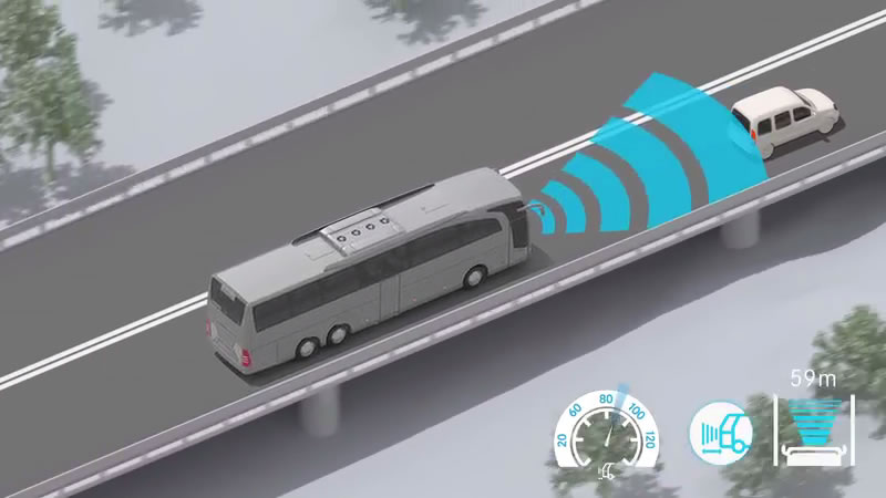 El ESP supervisa además la aceleración transversal del vehículo. Si el autocar alcanza una situación crítica en curvas prolongadas, como una salida de autopista, o durante un cambio rápido de carril, se reduce automáticamente la velocidad del vehículo hasta que ha recuperado la estabilidad. El programa electrónico de estabilidad es comparable con el sistema utilizado en los turismos, pero cuenta con funciones ampliadas, adecuadas al uso en este tipo de vehículos.